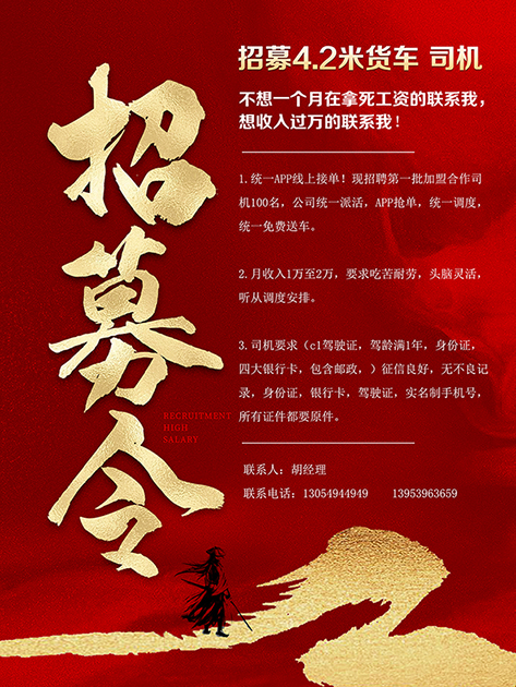 招募4.2米货车 司机,不想一个月在拿死工资的联系我,想收入过万的联系我!