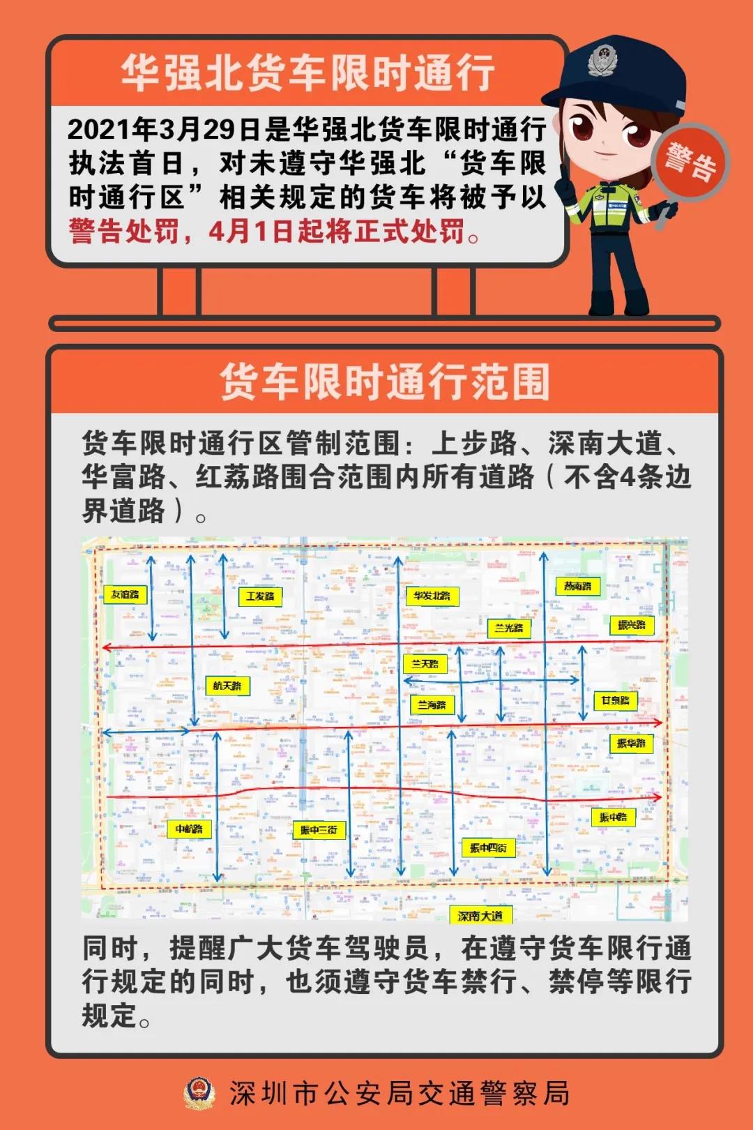深圳交警于2021年3月12日起在华强北实施货车"限时通行"措施,3月29日是华强北货车限时通行执法首日,对未遵守华强北“货车限时通行区”相关规定的货车予以警告处罚,4月1日起将正式处罚。